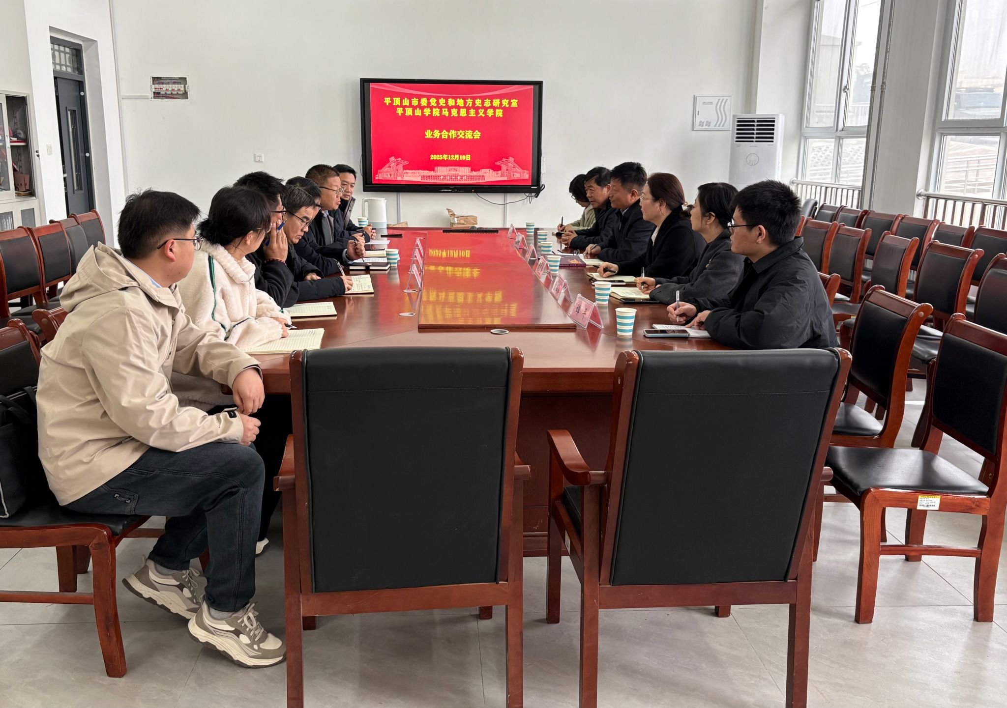 12月10日,中共平顶山市委党史和地方志研究室主任郭铁锋、副主任刘彦君、二级调研员赵会平、四级调研员董灿灿到我院开展业务合作专题洽谈。平顶山学院宣传部部长、马克思主义学院党总支书记吴建彪,马克思主义学院副院长王培文、吴少伟出席会议,我院部分博士代表列席会议。